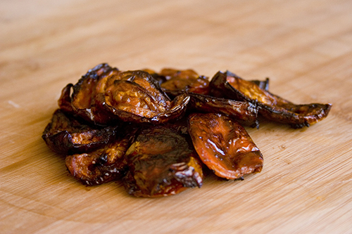 Seriously, roast some tomatoes now. Start preheating your oven to 325 degrees then lightly spray a tin foil lined baking pan or cookie sheet with oil. Cut stem tops off some tomatoes (I used Roma’s) then cut into fourths. Coat with olive oil, sea salt, fresh cracked black pepper and some fresh chopped garlic. Mix by hand and lay out on tin foil and bake for 2 – 3 hours. Your whole house will soon smell like heaven. You can eat them right out of oven or blend into a tomato paste to use in other foods or as a spread. It’s yumtastic, go now