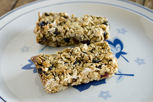 Combine 1 1/2 c. oats and 2 c. mixed seeds, berries, and nuts. Separately mix 1/2 a can of condensed milk with 1 T. molasses. Then combine the two mixtures into one and press into a 8×8 oiled pan and bake at 350 degrees for 25-30 minutes or until the top starts to brown. Easy peasy!